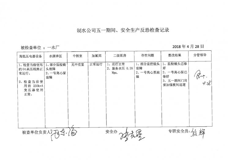 一水厂2018年4月安全生产检查记录