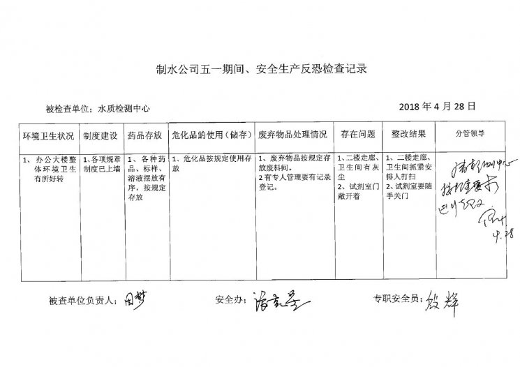 水质检测中心2018年4月安全生产检查记录