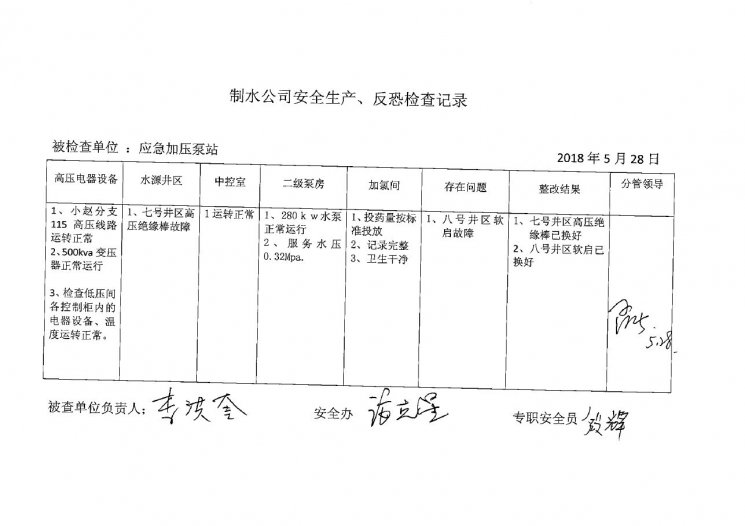 加压泵站2018年5月安全生产检查记录