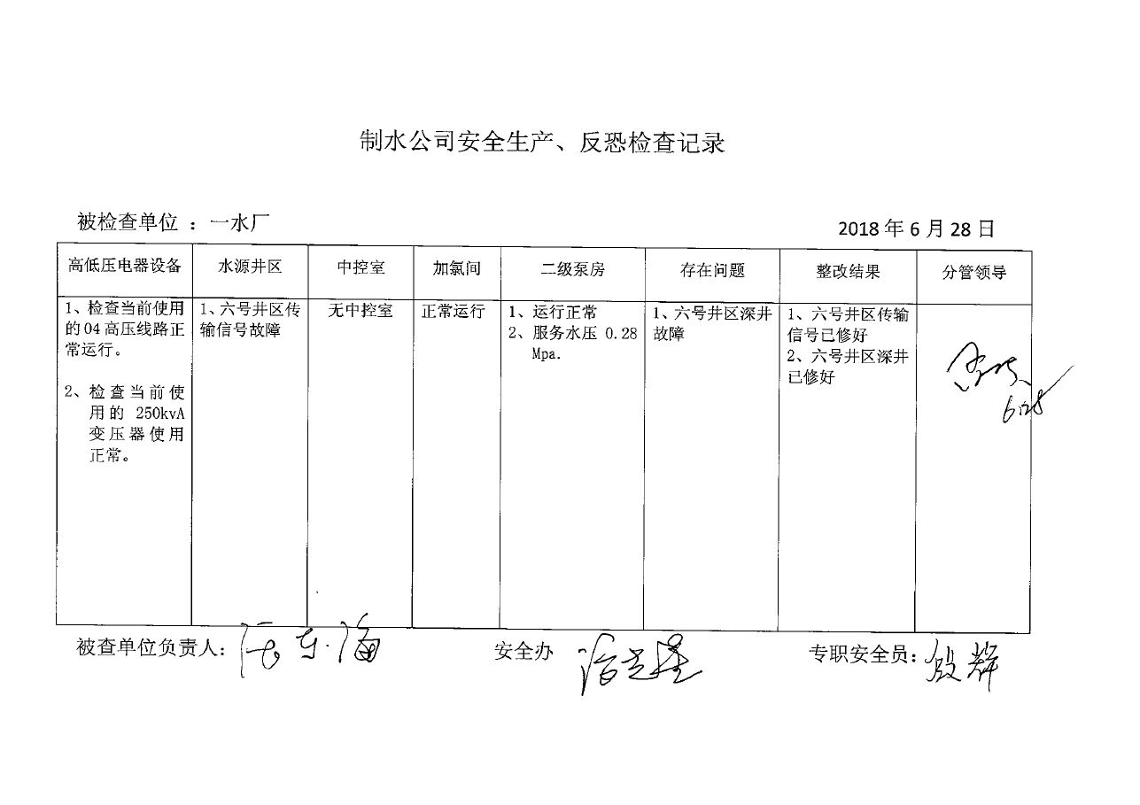 一水厂2018年6月安全生产检查记录