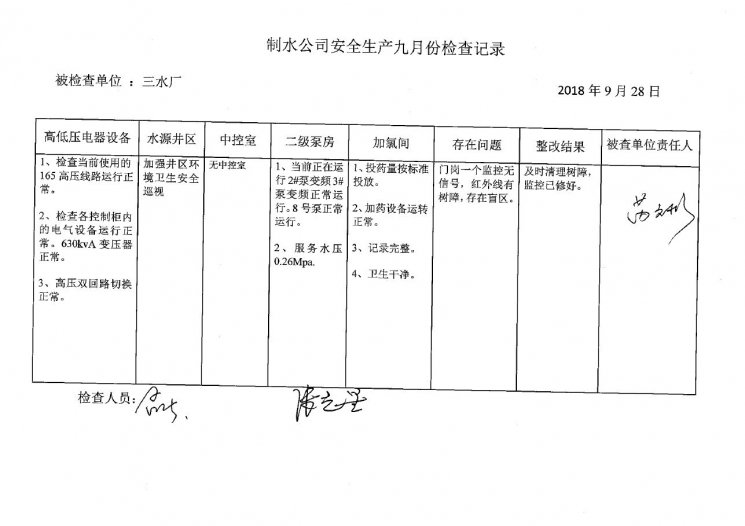 三水厂2018年9月安全生产检查记录