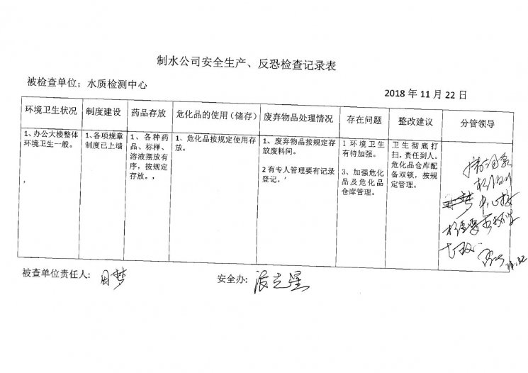 水质检测中心2018年11月安全生产检查记录