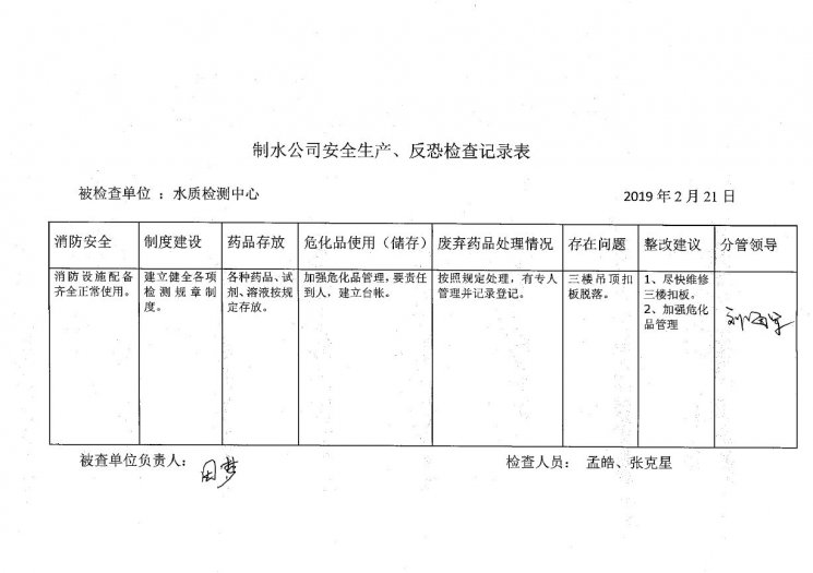 水质检测中心2019年2月安全生产检查记录