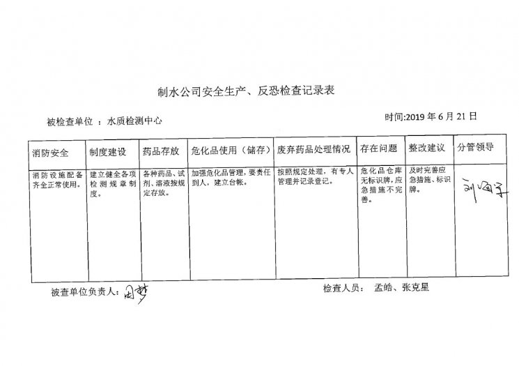 水质检测中心2019年6月安全生产检查记录