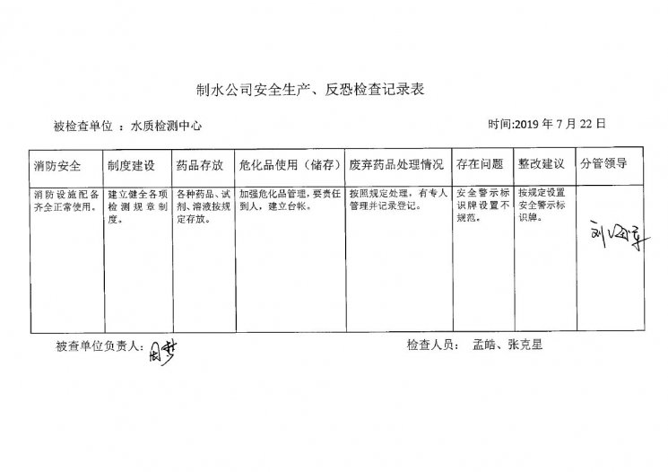 水质检测中心2019年7月安全生产检查记录