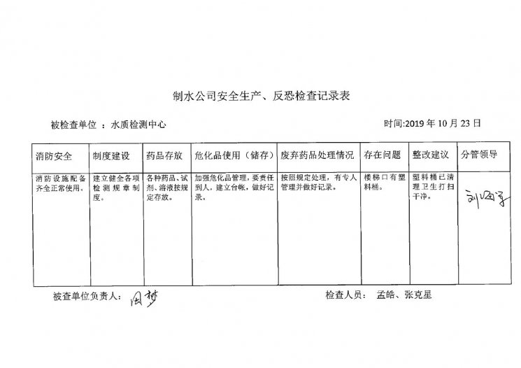 水质检测中心2019年10月安全生产检查记录