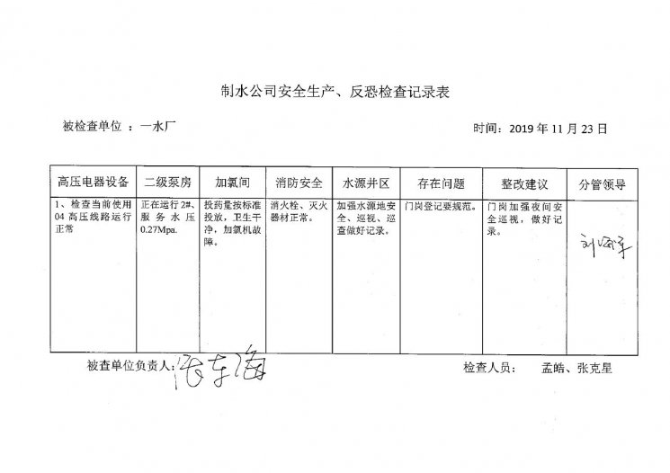 一水厂2019年11月安全生产检查记录