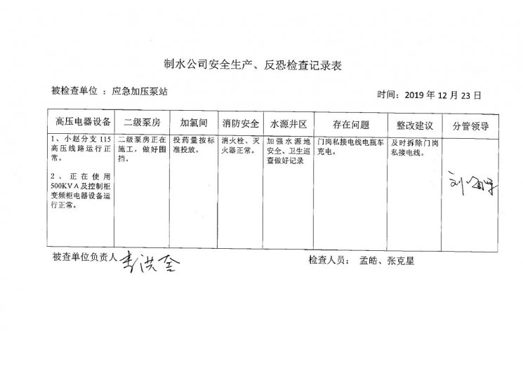 应急加压泵站2019年12月安全生产检查记录