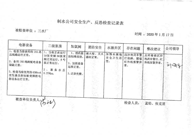 三水厂2020年1月安全生产检查记录