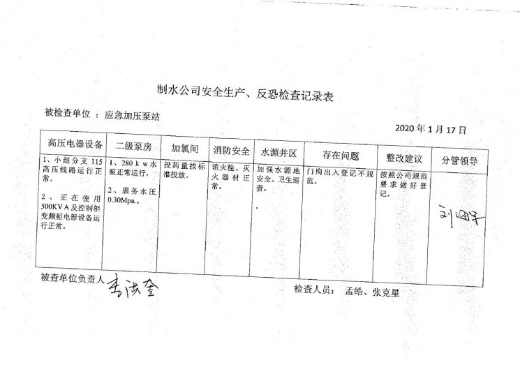 应急加压泵站2020年1月安全生产检查记录