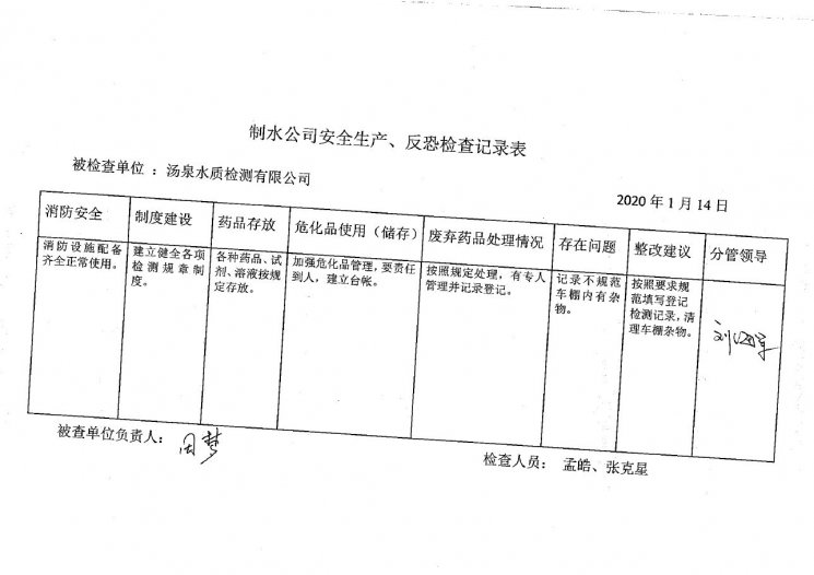 汤泉水质检测中心2020年1月安全生产检查记录