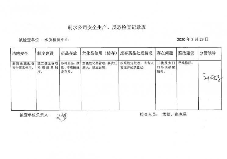 水质检测中心2020年3月安全生产检查记录