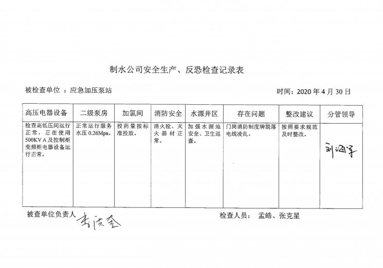 应急加压泵站2020年4月安全生产检查记录