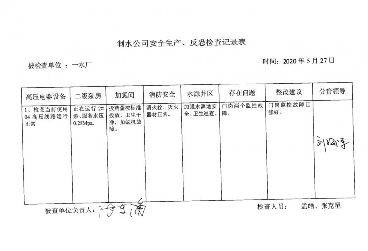 一水厂2020年5月安全生产检查记录