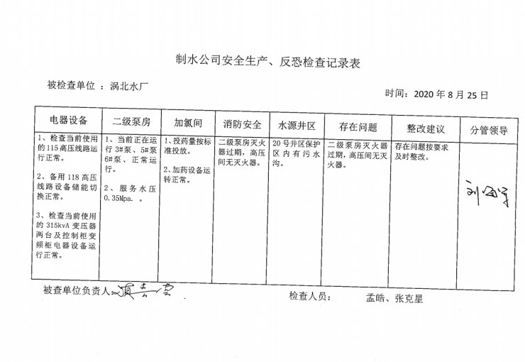 涡北水厂2020年8月安全生产检查记录