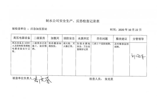 加压泵站2020年10月安全生产检查记录