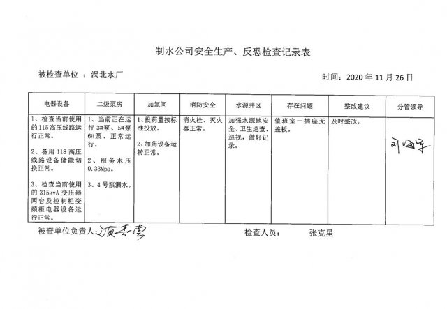 涡北水厂2020年11月安全生产检查记录