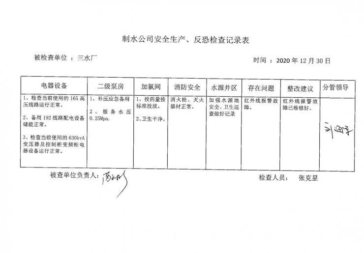 一水厂2020年12月安全生产检查记录
