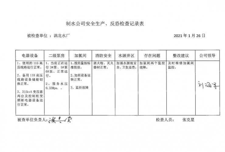 涡北水厂2021年1月安全生产检查记录