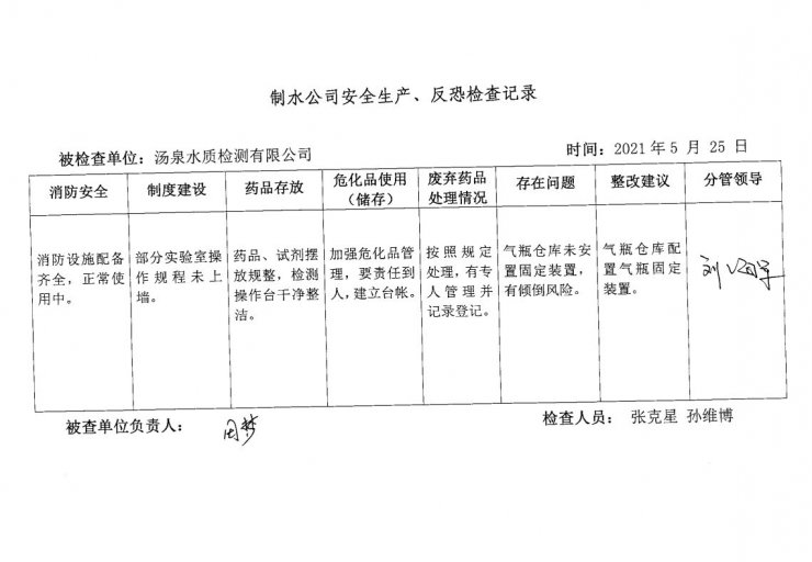 汤泉水质检测中心2021年5月安全生产检查记录