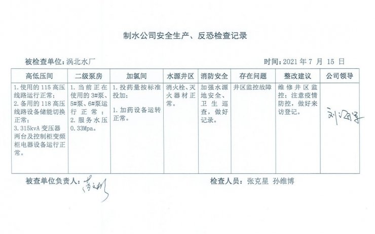 涡北水厂2021年7月安全生产检查记录