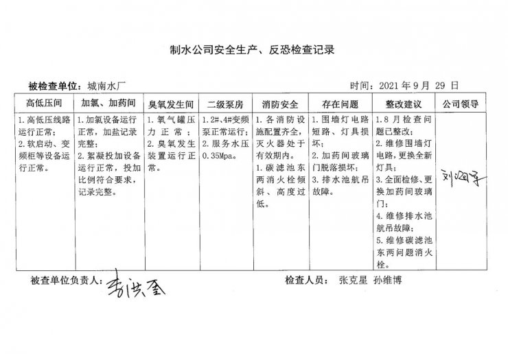城南水厂2021年9月安全生产检查记录