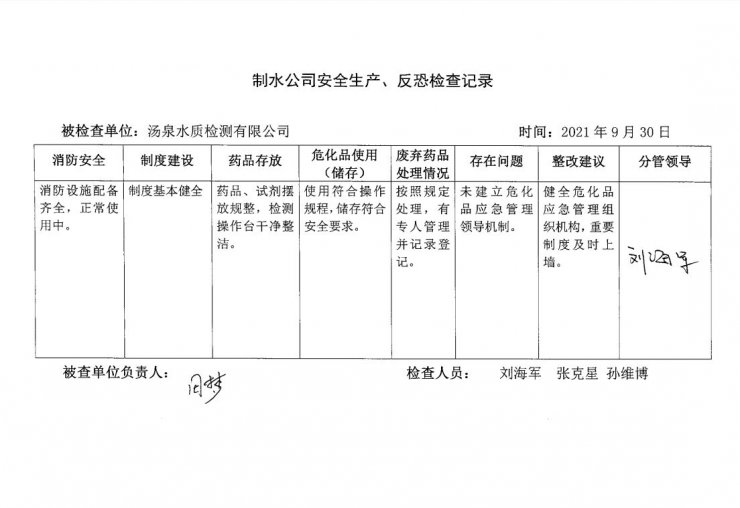 汤泉水质检测中心2021年9月安全生产检查记录