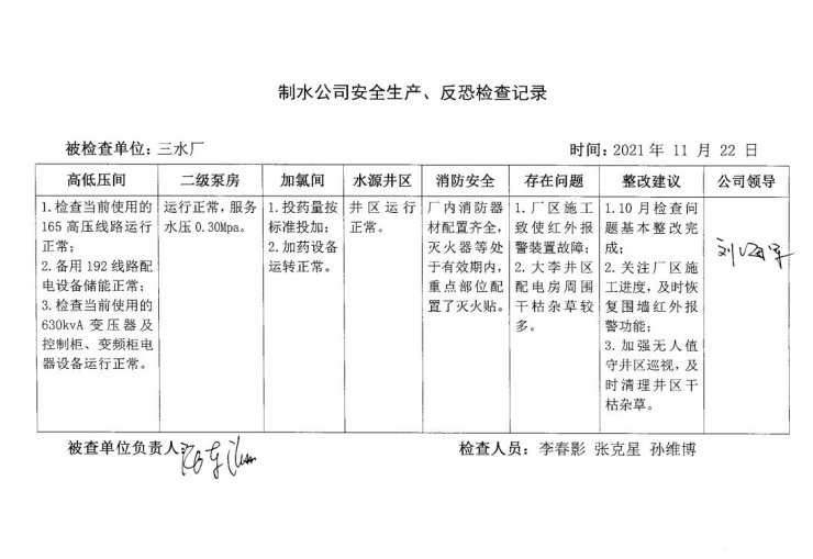三水厂2021年11月安全生产检查记录
