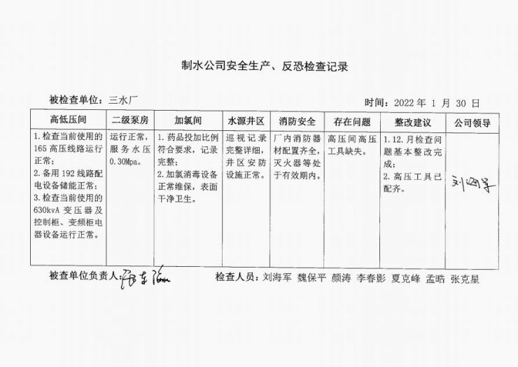 三水厂2022年1月安全生产检查记录