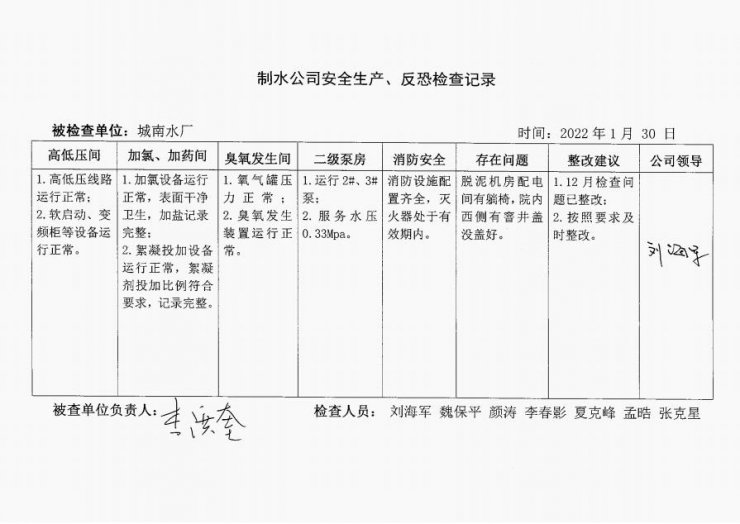 城南水厂2022年1月安全生产检查记录