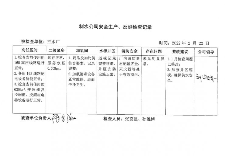三水厂2022年2月安全生产检查记录