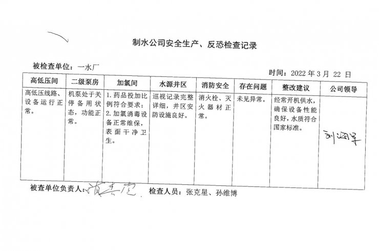 一水厂2022年3月安全生产检查记录