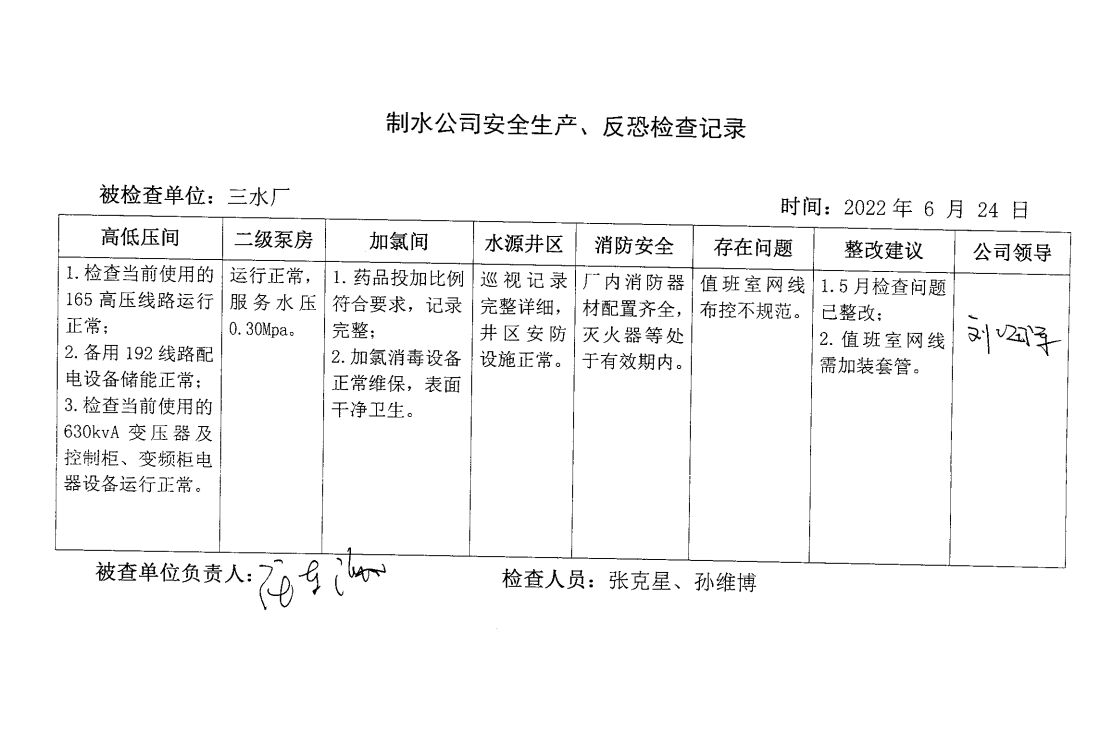 涡北水厂2022年6月安全生产检查记录
