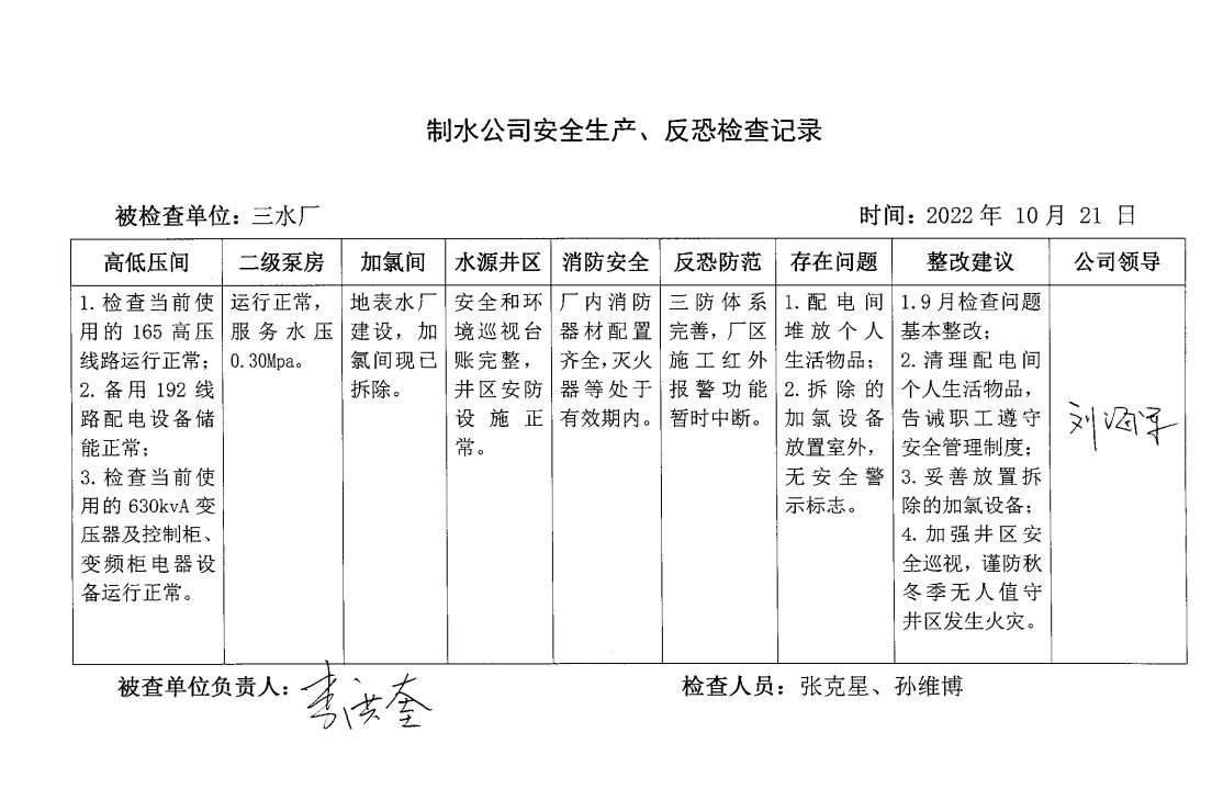 三水厂2022年10月安全生产检查记录