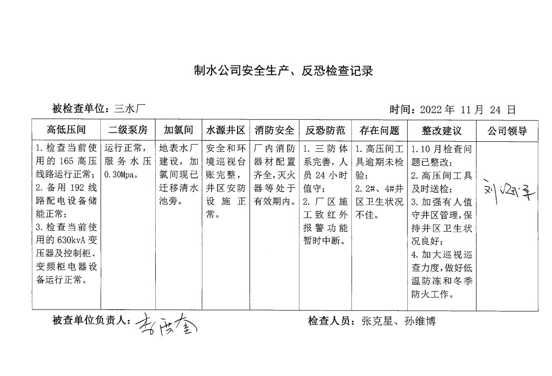 三水厂2022年11月安全生产检查记录