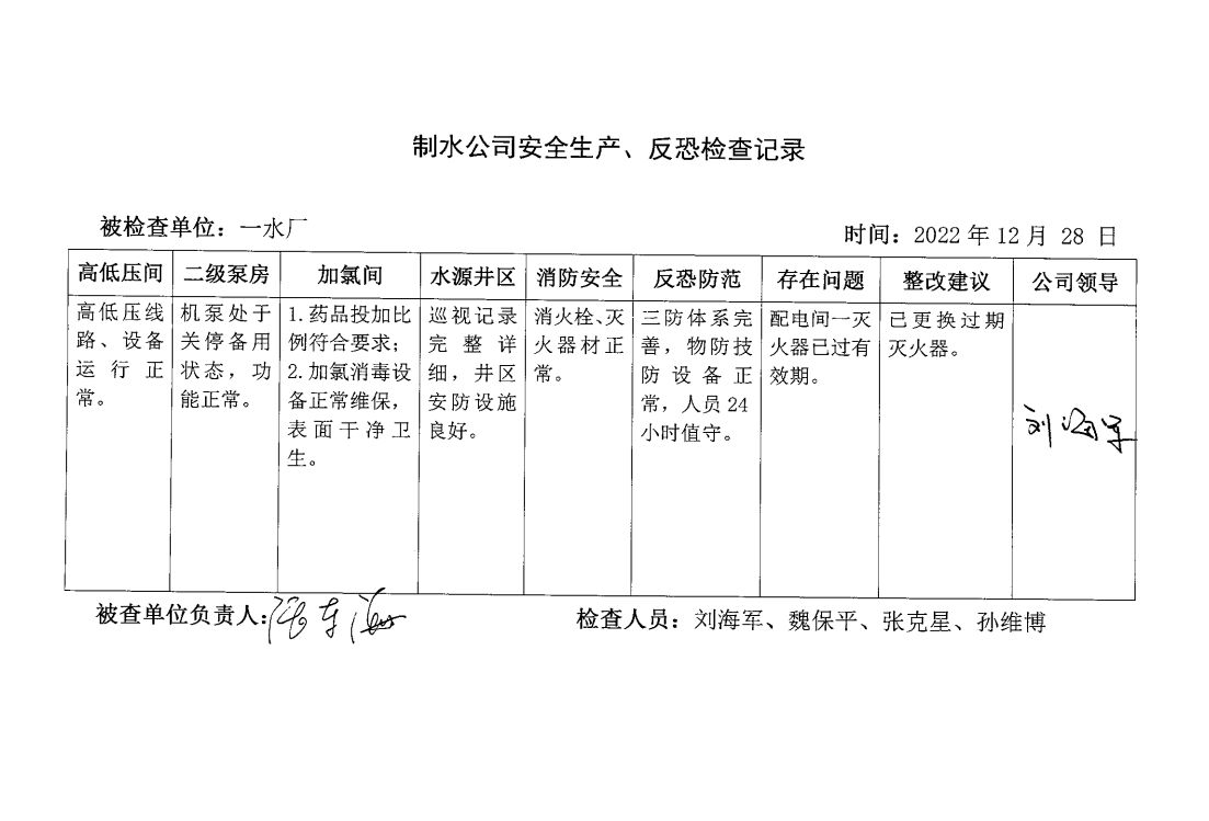涡北水厂2022年12月安全生产检查记录