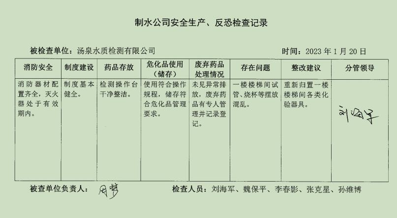 汤泉水质检测中心2023年1月安全生产检查记录