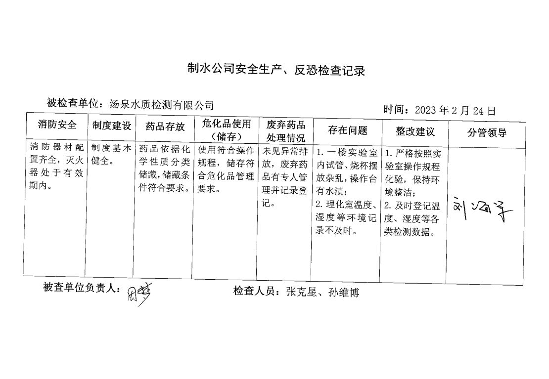 汤泉水质检测中心2023年2月安全生产检查记录