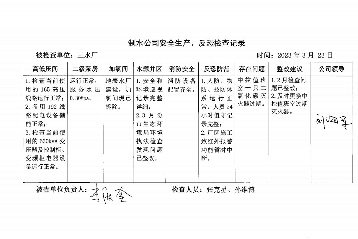 三水厂2023年3月安全生产检查记录