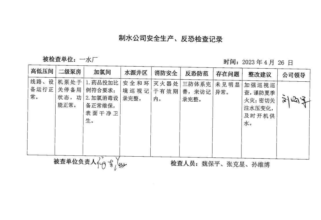 一水厂2023年4月安全生产检查记录