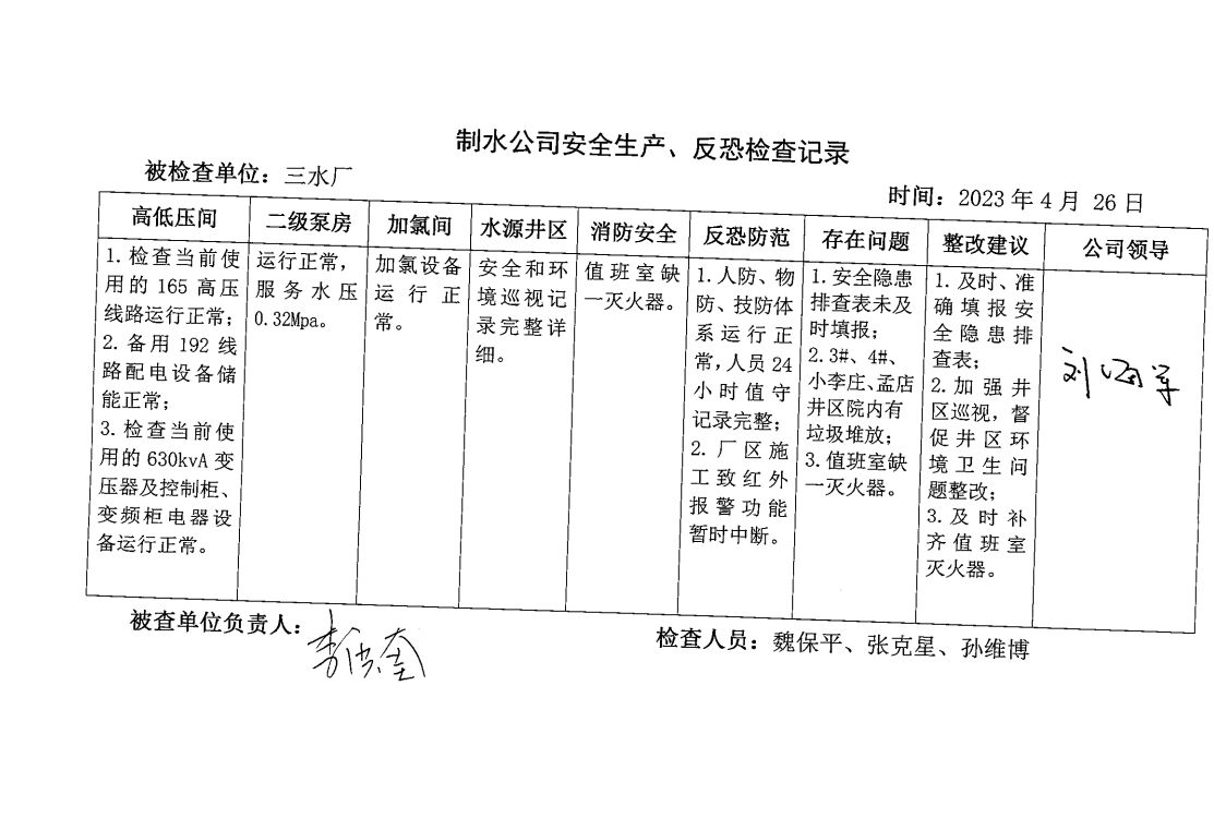 一水厂2023年4月安全生产检查记录