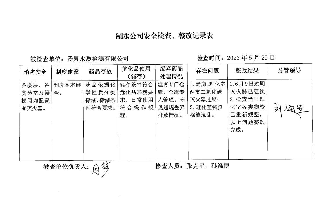 汤泉水质检测中心2023年5月安全生产检查记录