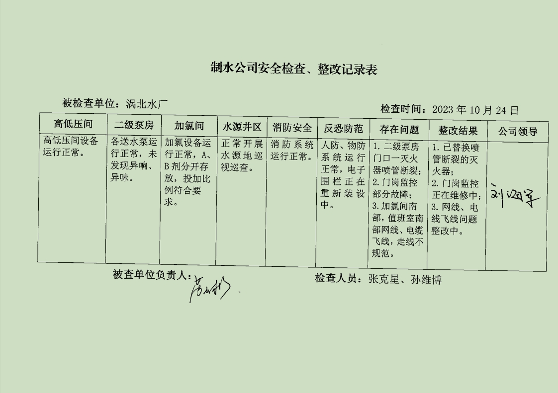 涡北水厂2023年10月安全生产检查记录