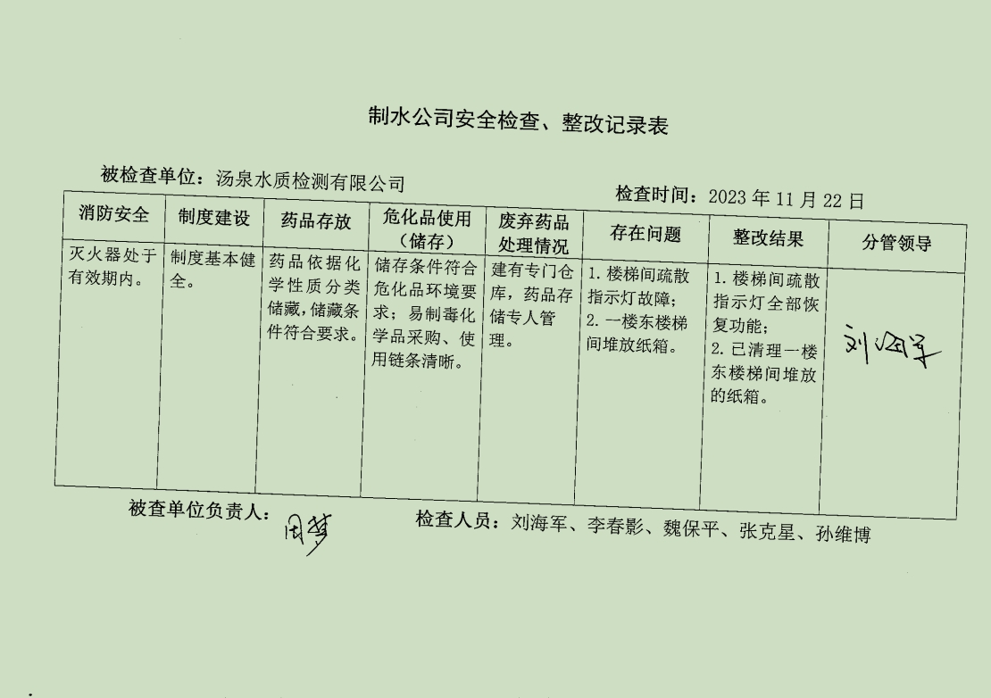 汤泉水质检测中心2023年11月安全生产检查记录