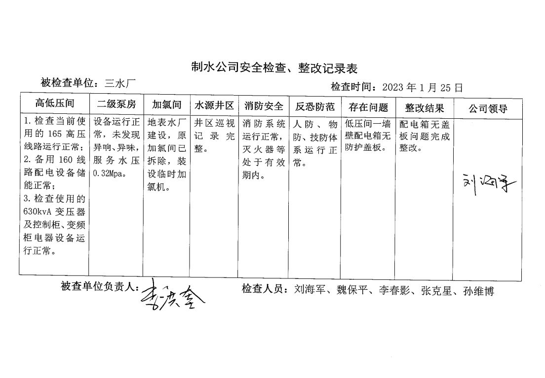 涡北水厂2024年1月安全生产检查记录