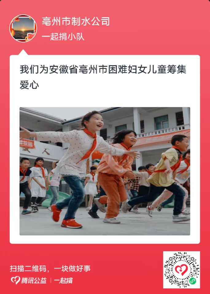为了更好的服务广大妇女儿童,营造妇女儿童健康发展的良好社会环境,根据省妇联相关要求,亳州市妇联依托“腾讯公益”平台,在安徽省妇女儿童发展基金会发起的“皖家妇儿关爱行动”项目下,发起“亳州妇儿关爱行动”子计划。亳州市制水公司依据文件精神和操作流程及时组建队伍,发动公司员工积极参与此次募捐活动。