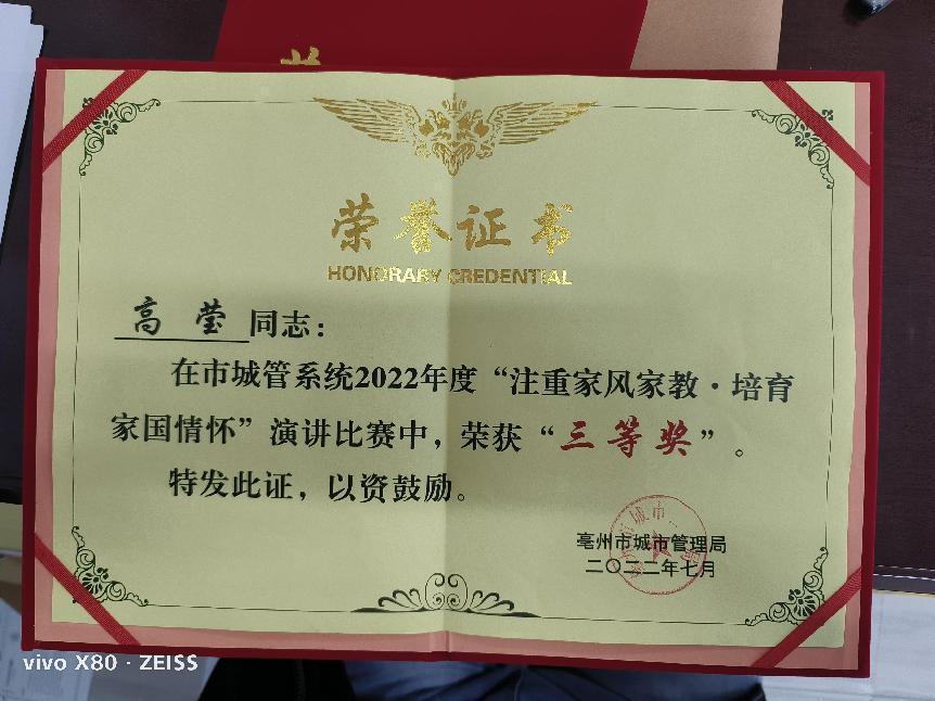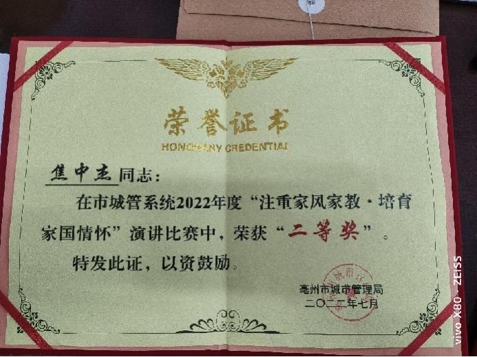 为深入贯彻落实习近平总书记关于“注重家庭、注重家教、注重家风”重要指示精神,大力弘扬中华民族家庭美德,切实以家风促作风,由亳州市城市管理局举办的“注重家风教育•培育家国情怀”演讲比赛已经顺利结束。赛中市制水公司焦中杰、高莹两位同志紧扣“注重家风家教•培育家国情怀”的主题,立足岗位,结合实际,经过激烈的角逐最终分别获得了二等奖、三等奖的优异成绩。
