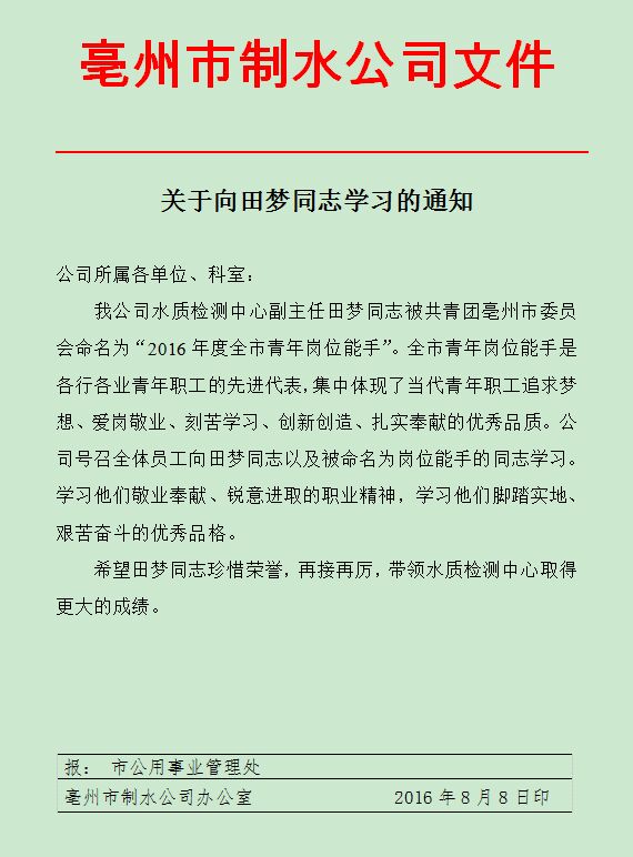 信息来源: 亳州市制水公司