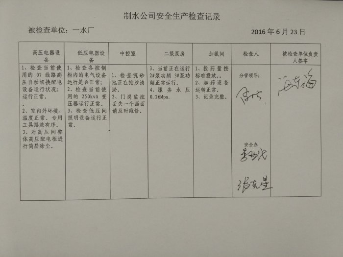 一水厂2016年6月安全生产检查记录