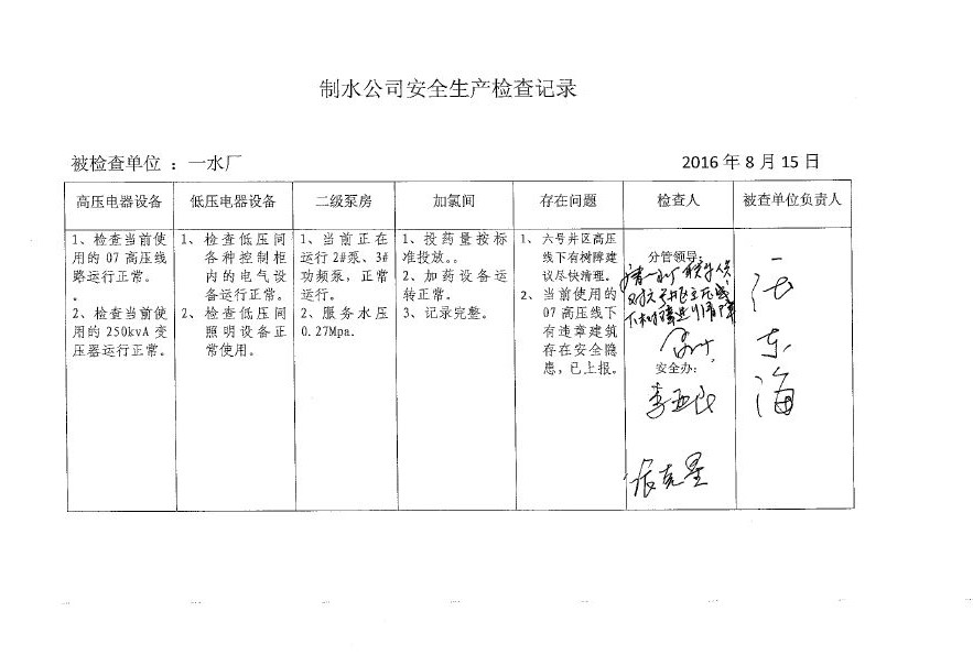 一水厂2016年8月安全生产检查记录